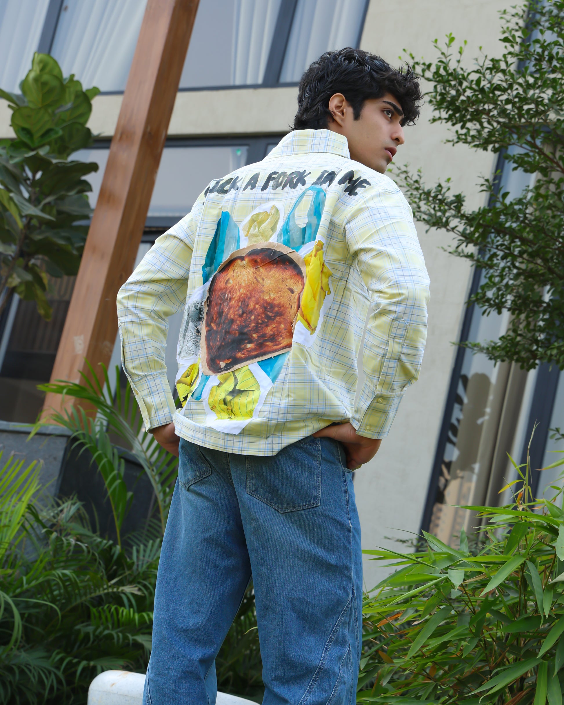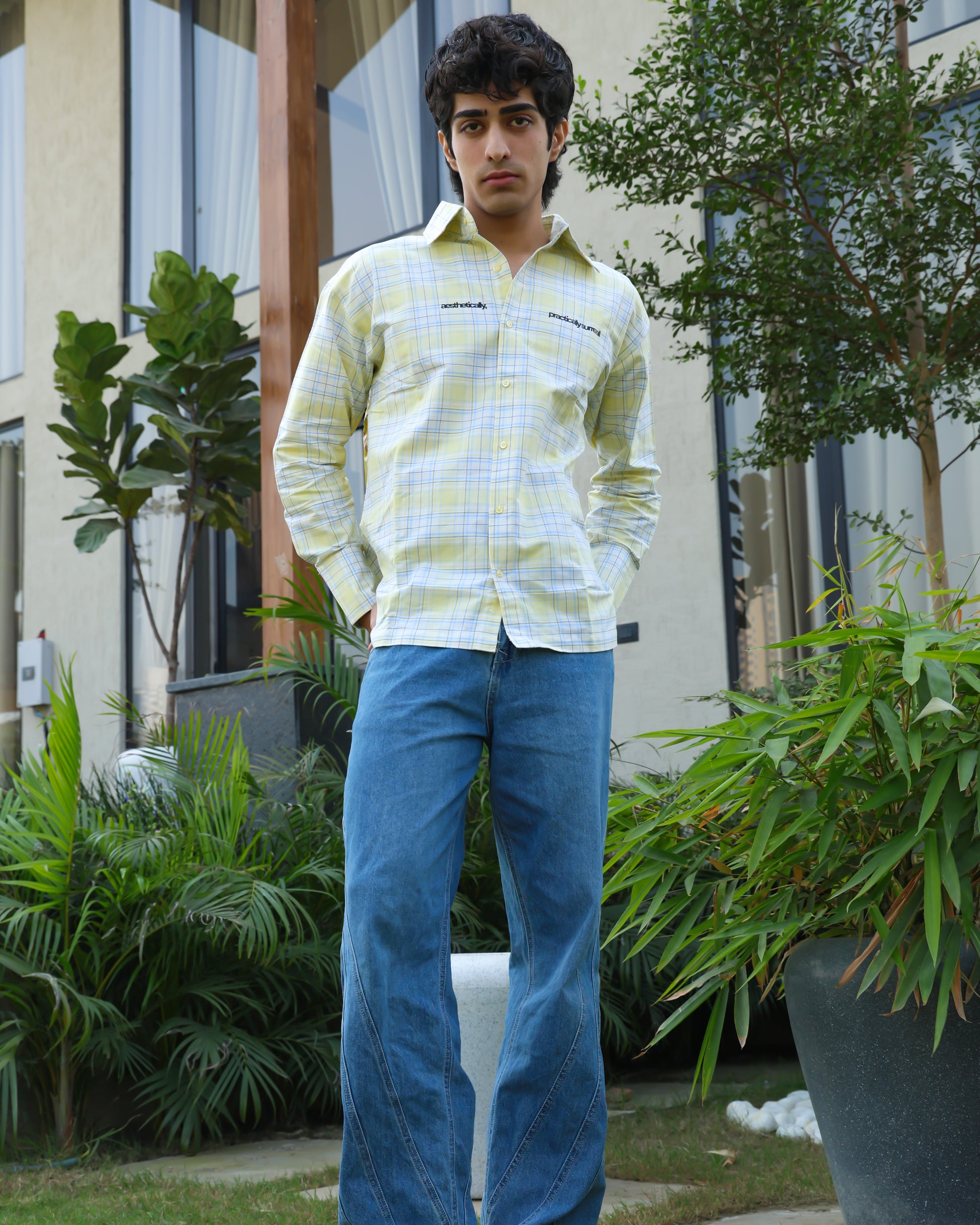 Tailored from 100% premium dyed cotton, the fabric carries a pale yellow checkered weave light, breathable, and structured with refined clarity. The front is marked with Esthreall’s mantra, “aesthetically practically surreal”, printed in black direct, minimal, and grounding. The buttons are buttery yellow in pearl shell gloss material. The bottom is straight hem.