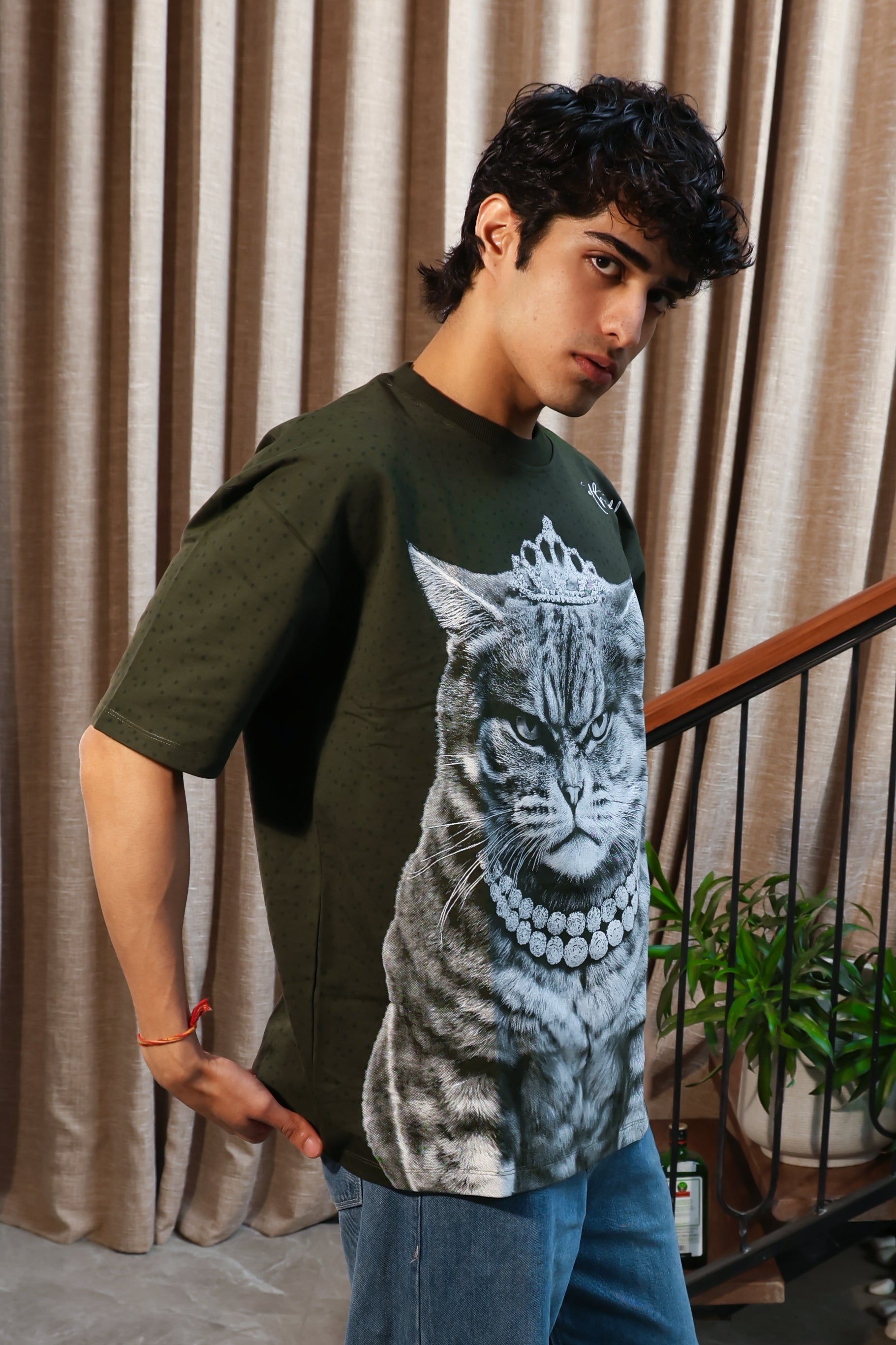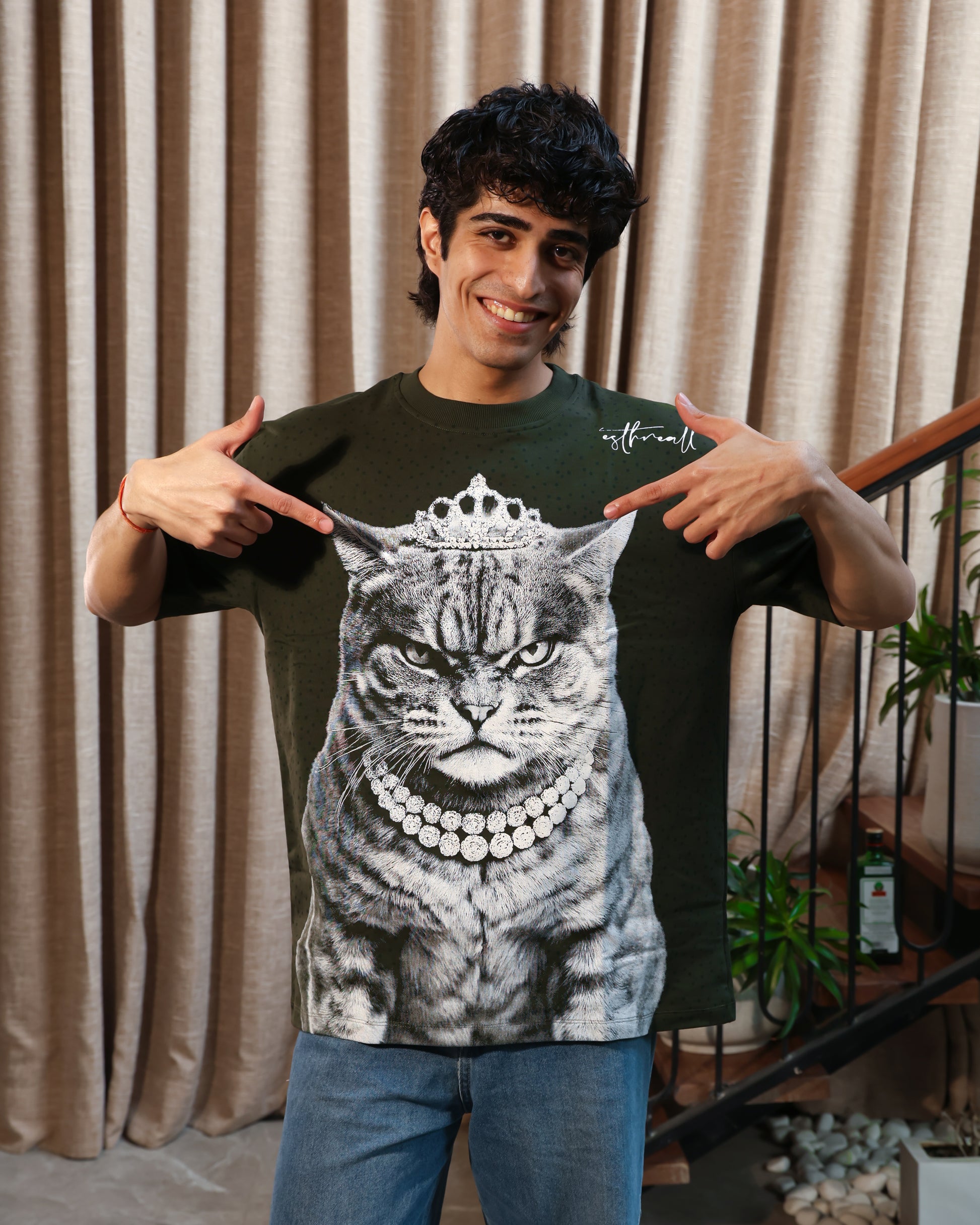 The surface is layered with an all-over dotted screen print, interrupted at the front by a pearl-finish artwork of a grumpy royal cat, an emblem of quiet rebellion and elegance. Esthreall branding anchors the motif, understated yet deliberate.