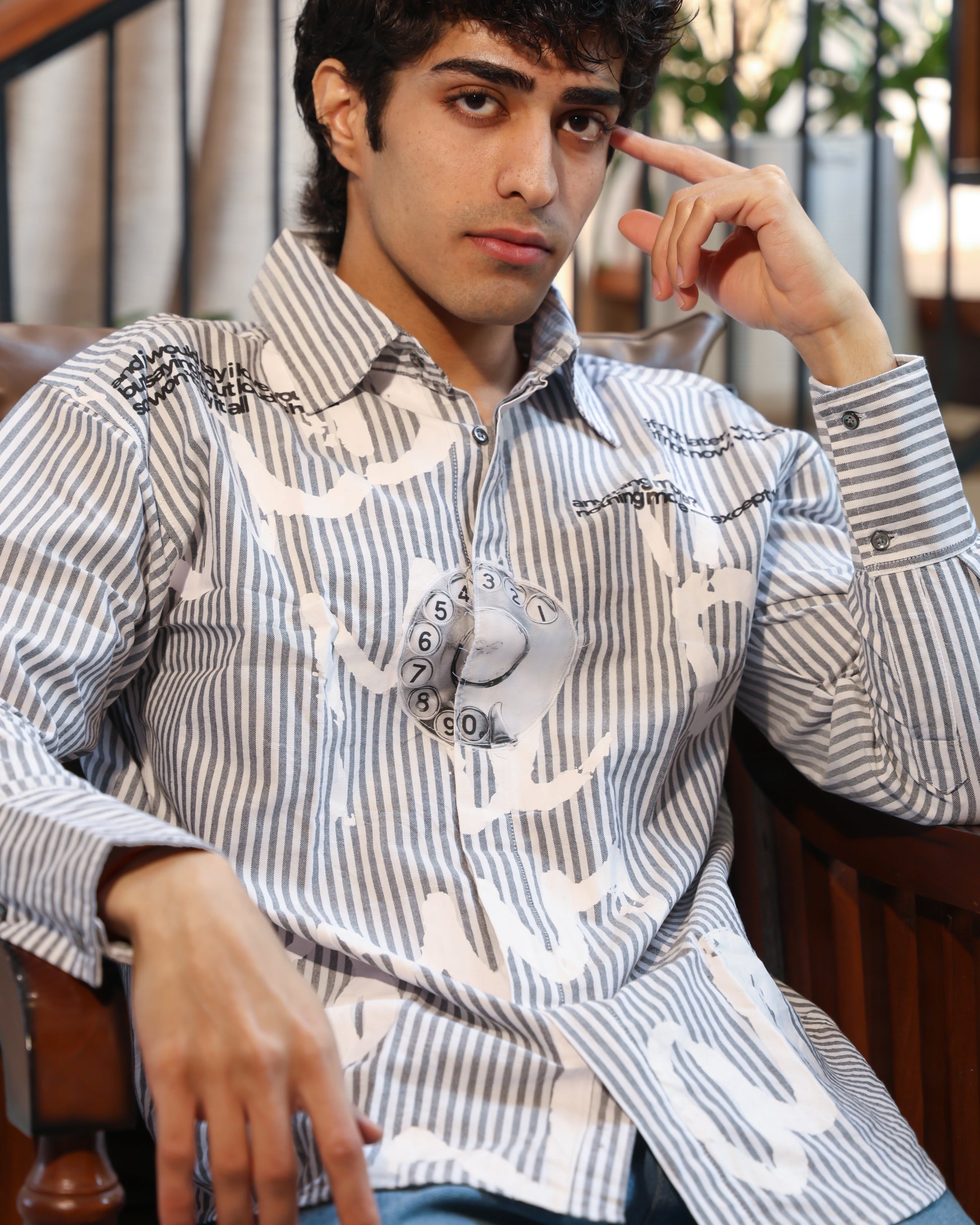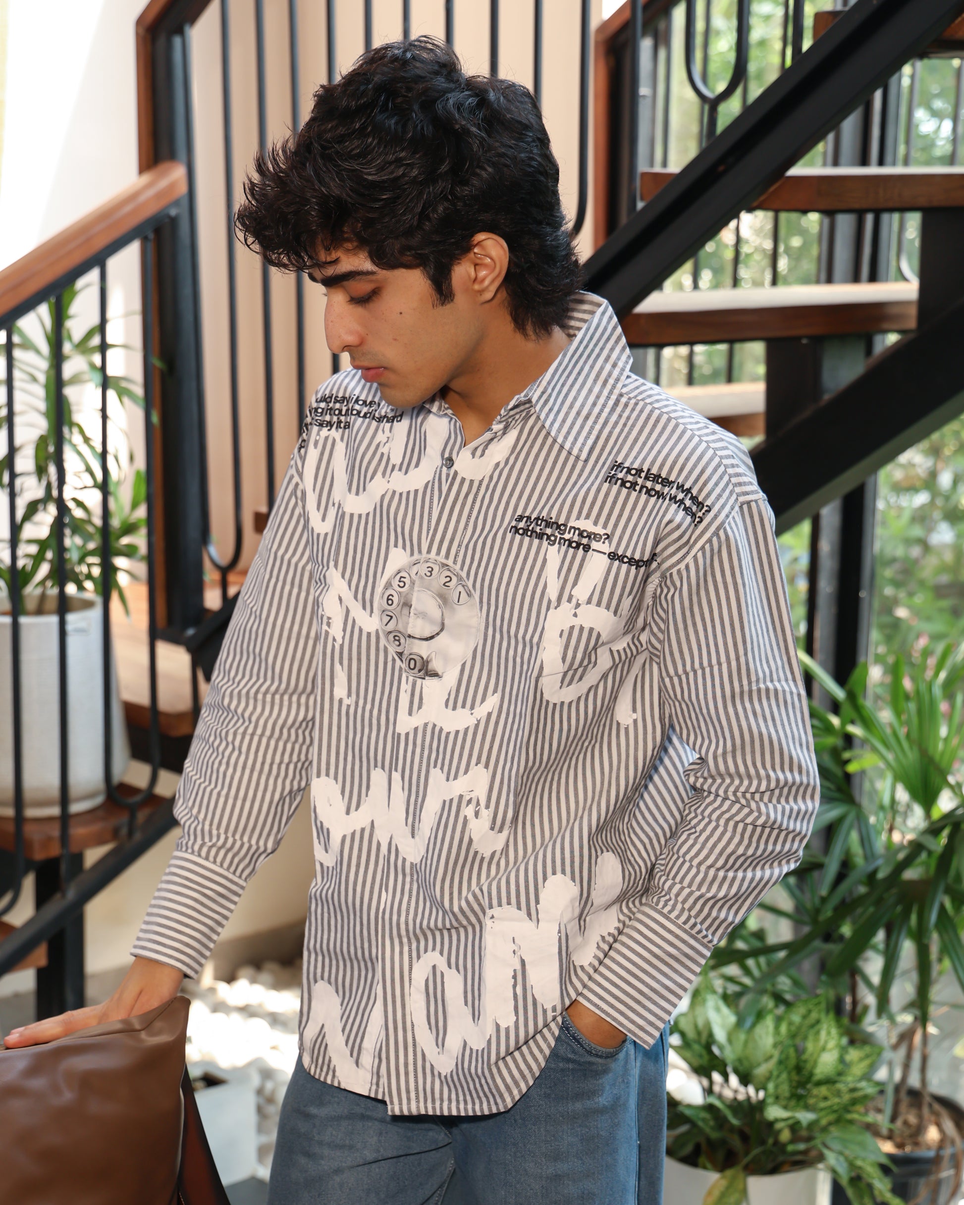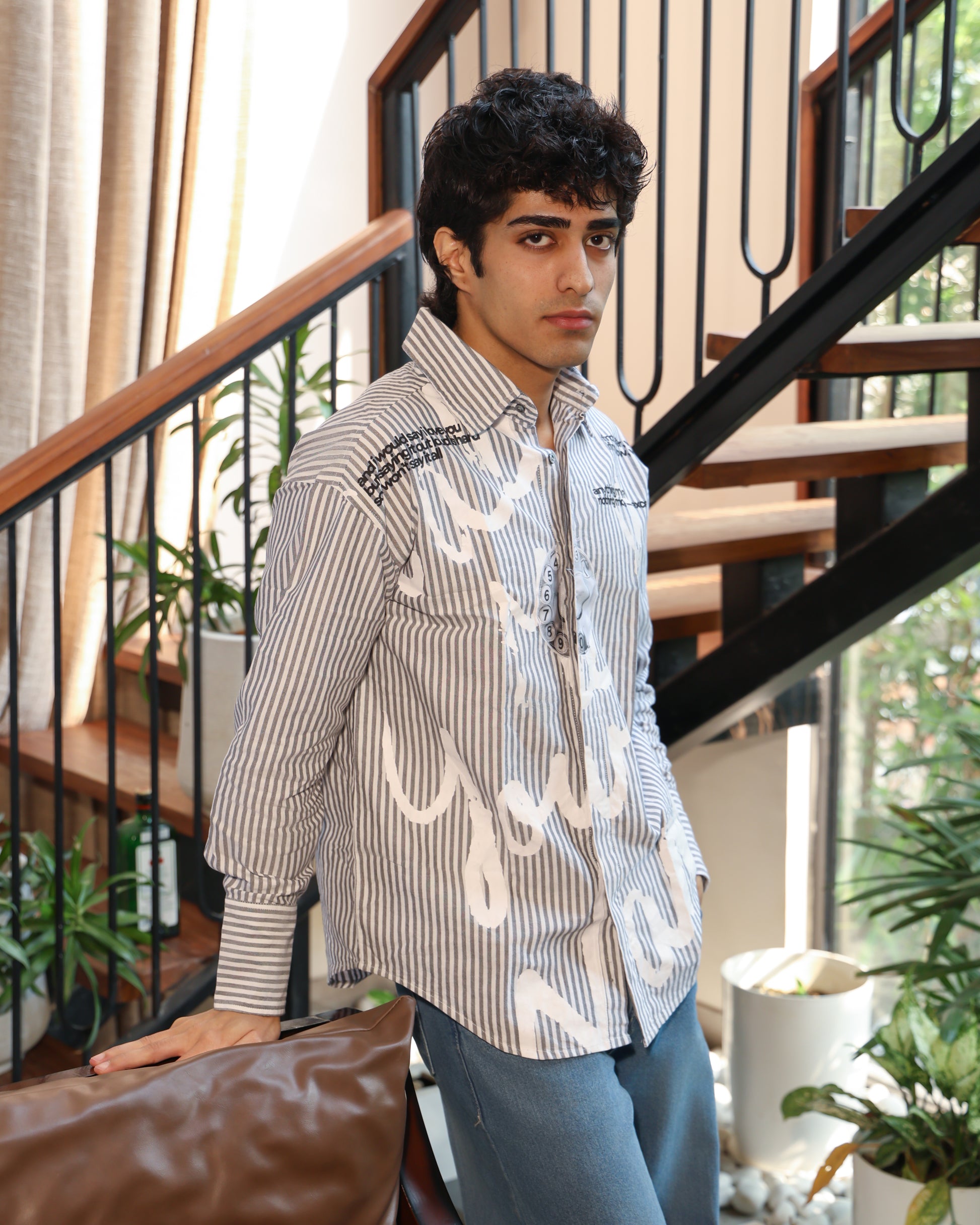 Oxford cotton striped shirt in pastel grey (unisex), tailored in a full-sleeve silhouette. Designed with a split straight collar and hidden button-up front, finished with deep-dyed charcoal grey pearl shell buttons. The cut features an apple hem and elongated cuffs for balance and refinement.
