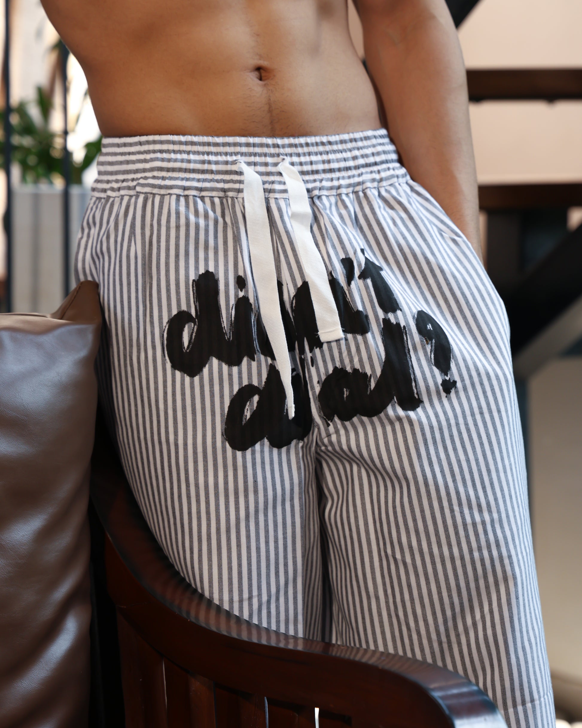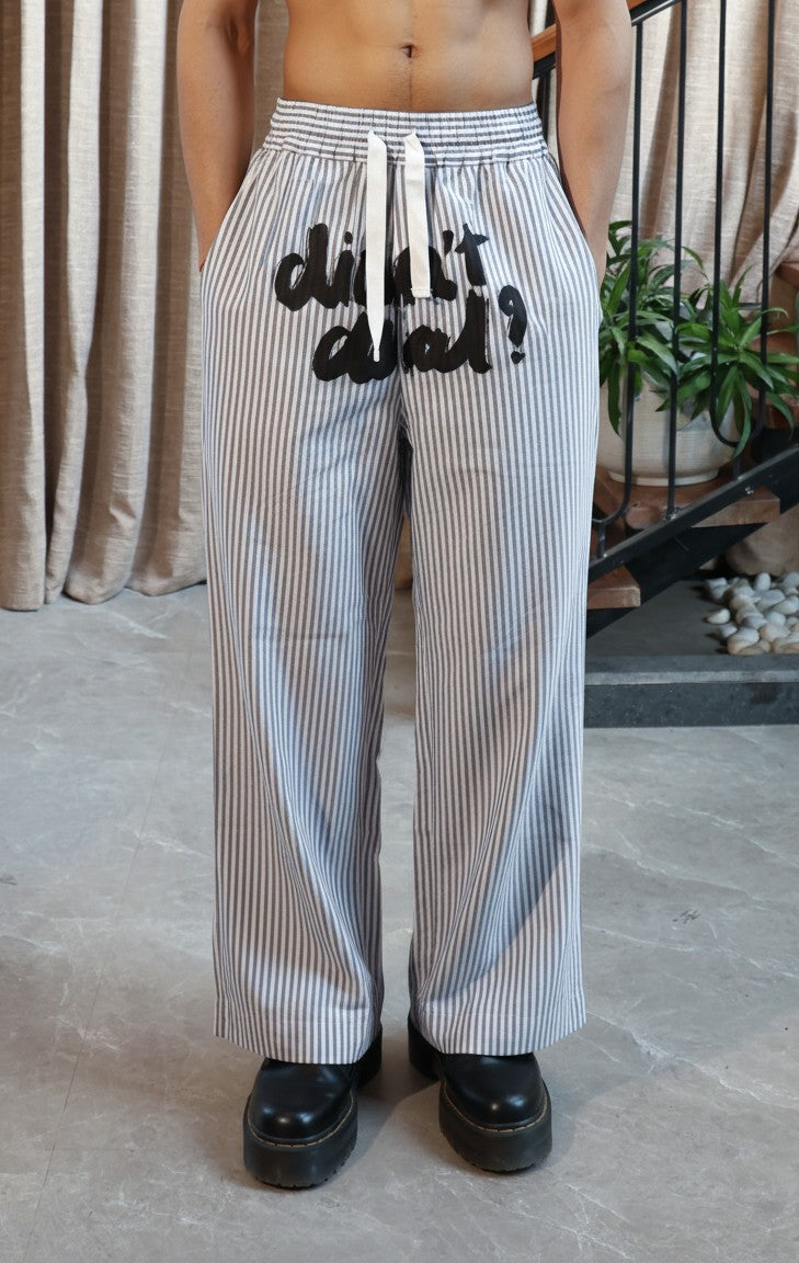 Oxford cotton striped pants tailored in an (unisex) oversized wide-leg silhouette. Designed for a mid-waist fit with adjustable drawstring for ease and proportion. Features camouflaged side pockets along the stripes and two structured patch pockets at the back.