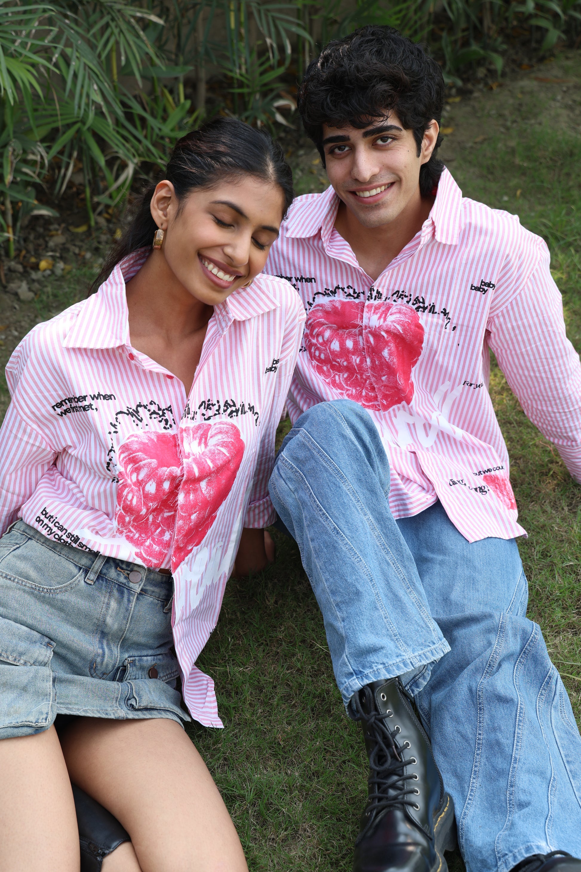 Oxford Cotton Striped Shirt crafted from premium long-staple cotton (unisex). Designed with a split straight collar and hidden button-up front, elevated by deep-dyed raspberry pearl shell buttons. The silhouette features an apple-cut hem and elongated cuffs for refined proportion.
