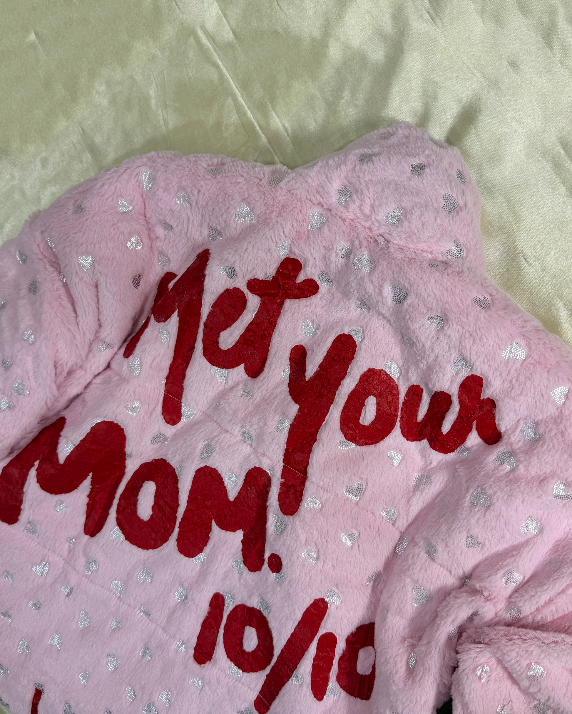 Bold Embroidery Accents: Features striking, high-contrast embroidery. The pink version showcases cheeky red text phrases on the chest and a large statement graphic on the back, such as "not your mom! 10/10" which will be raw and cracky.