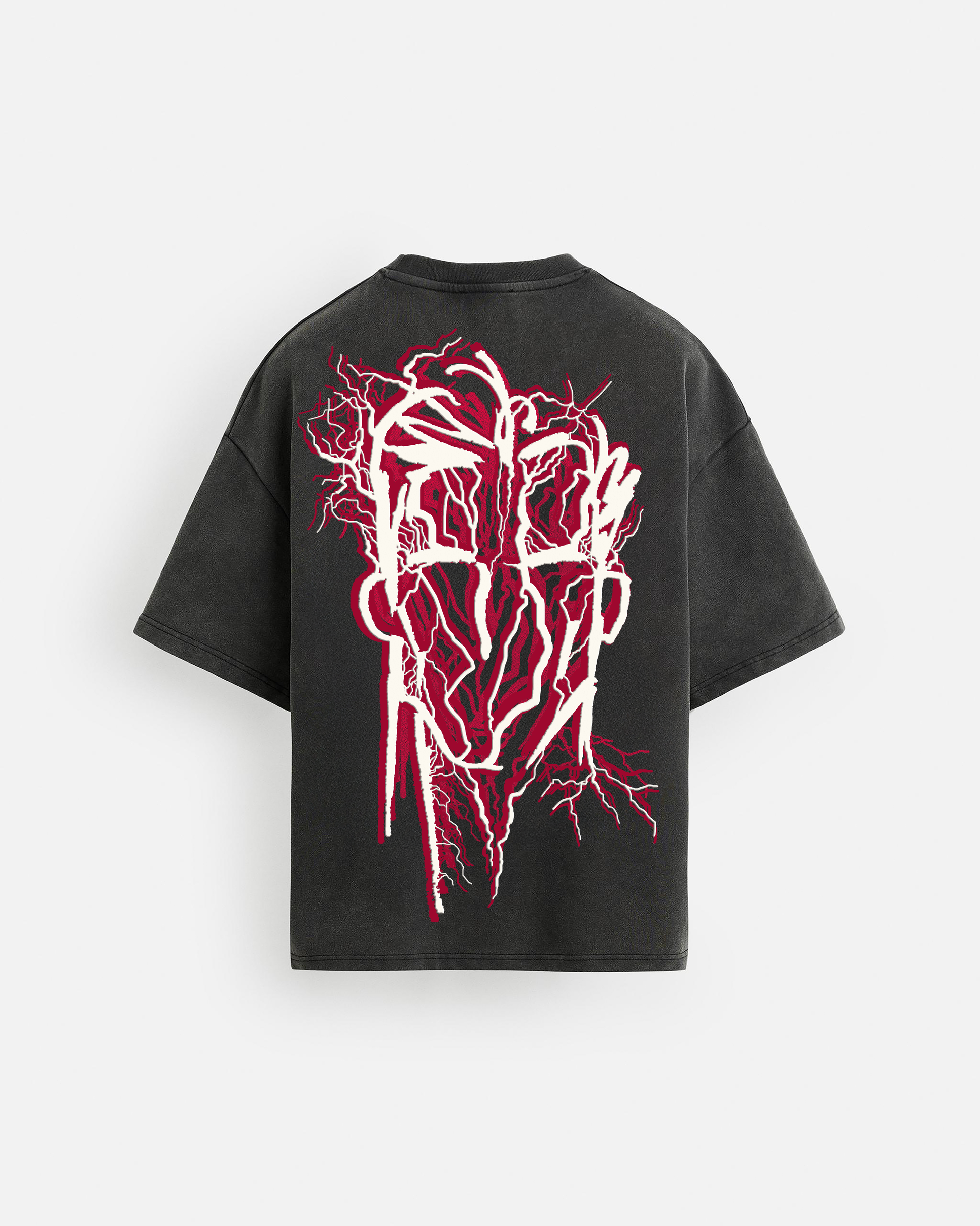 A classic round neckline and dropped shoulders anchor the form, while the front features a minimal brand screen print and tagline, understated yet intentional. The back unfolds into a bold contrast graphic, a visual statement that channels the brand’s raw, expressive energy.