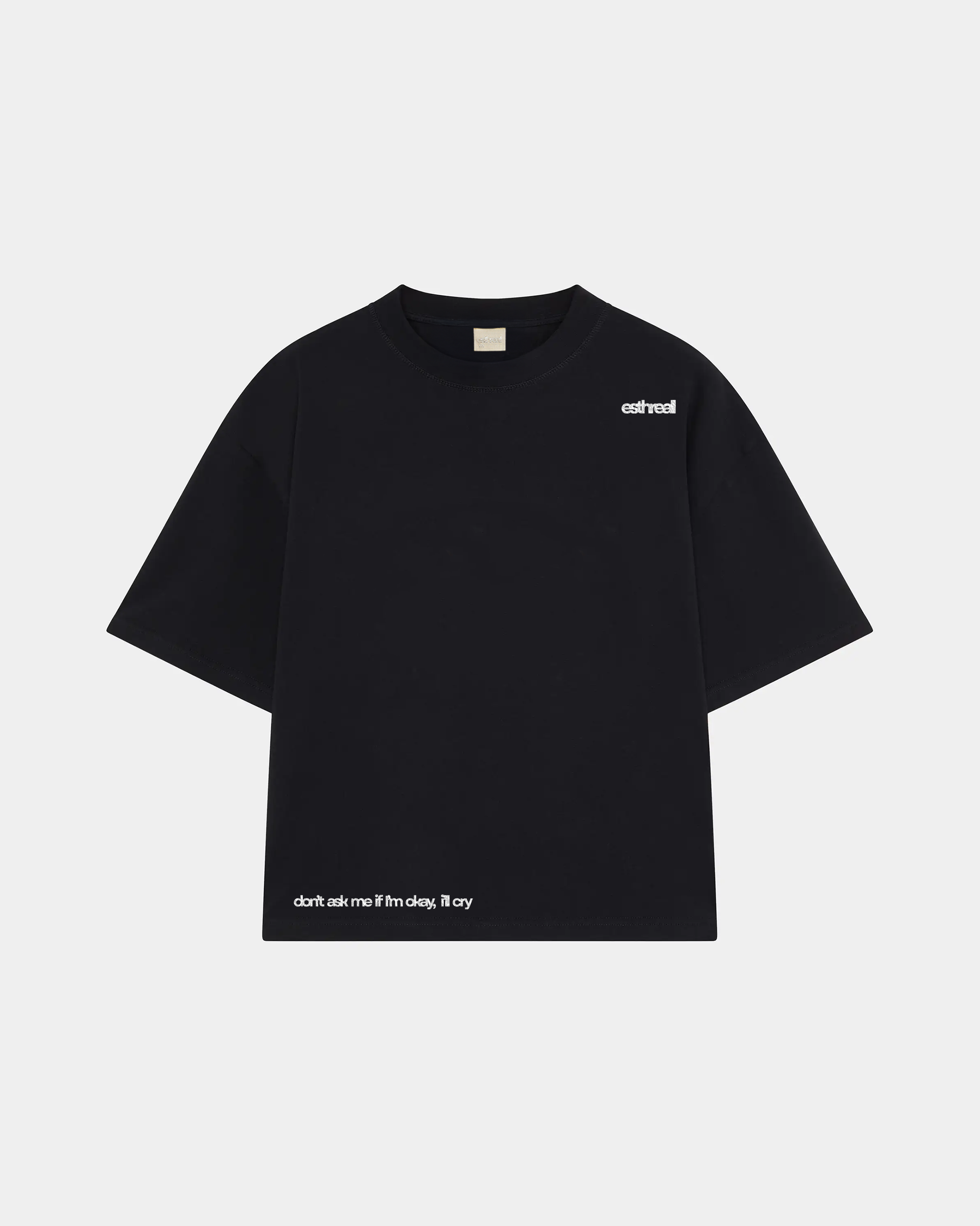 The front is defined by Esthreall embroidery brand name and tagline rendered in soft silicone off-white subtle yet texturally pronounced. At the back, the surface expands into an all-over white stain screen print, carrying a digitally infused graphic of a baby and cereals an arresting interplay of innocence and surreal imagery, seamlessly integrated into the garment’s canvas.